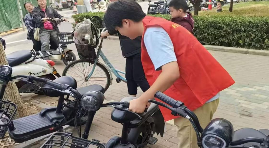 活动期间,志愿者们身着醒目的红马甲,积极投入到车辆整理工作中。他们有条不紊地对路边乱停乱放的车辆进行归位,耐心地将随意停放的自行车、电动车整齐排列,并主动提醒即将停车的同学将车辆停放在指定位置。