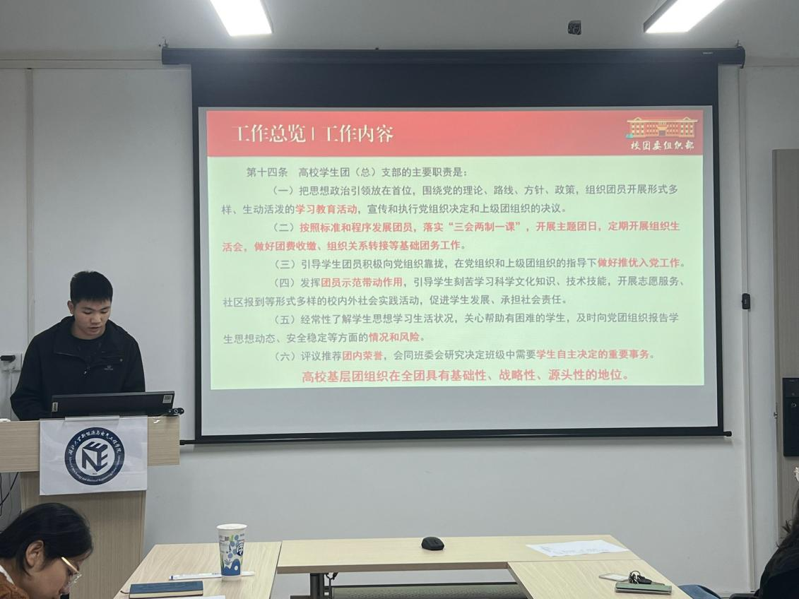 党旗所指,团旗所向。为进一步加强基层团组织建设,培养一支熟悉团史团情和团务工作,具备较高综合素质、较强实干精神和服务意识的学生团干部队伍,充分发挥团支部作为基层团组织的积极作用。10月25日晚,我院邀请校团委兼职副书记靳氏豪于双创楼B1013会议室对我院组织部干事及各班团支书开展基层团务工作培训会。