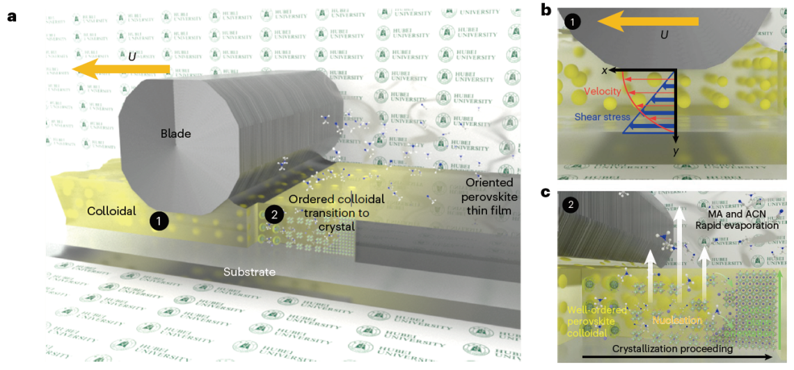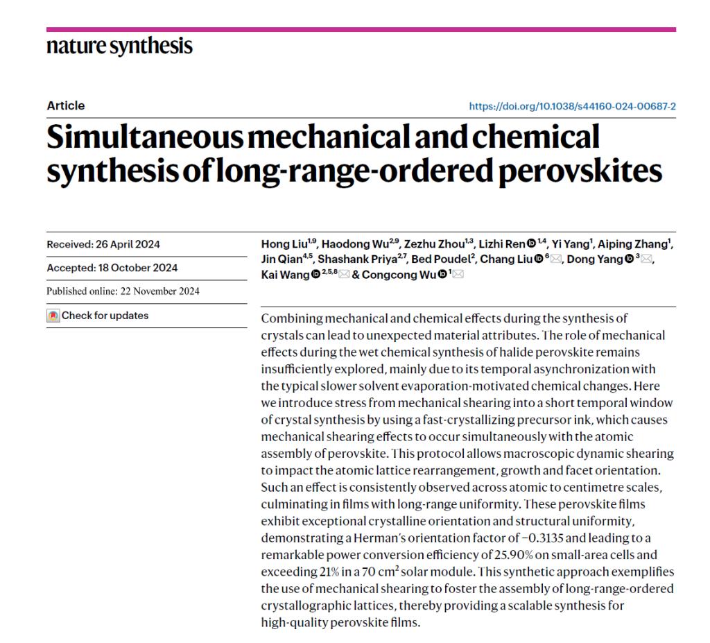 在该研究中,吴聪聪教授团队创造性地将机械作用与化学作用结合,通过引入“机械剪切力”来精确控制光电薄膜的晶体排列,这一突破性进展为材料晶体取向调控开辟了一个全新的路径。在传统方法中,缓慢的溶剂蒸发过程无法提供有效的机械作用窗口,导致形成无序的晶体薄膜。该项研究开发了一种全新的“快速结晶”前驱体溶液,使得机械剪切力得以在短时间内介入,能与钙钛矿的原子级组装保持高度同步。在此过程中,通过宏观动态剪切影响晶体生长取向,最终获得从原子尺度到宏观尺度均具高度有序性的光电晶体薄膜。这项研究为工业级制备高取向晶体薄膜提供了新的解决方案,提出了制造高性能功能转换器件的新思路。