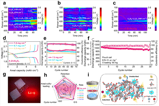 研究结果显示,在4C的高电流密度下,该无定形ZnAl2O4材料在800次循环后的容量保持率高达93.9%。此外,当硫负载达到4.5 mg cm−2,且电解质用量仅为8 μL mg−1时,软包电池仍表现出高的放电容量和稳定的循环性能。这一成果不仅为高效催化硫的氧化还原反应提供了新的途径,也为高性能锂硫电池的研发奠定了坚实基础。