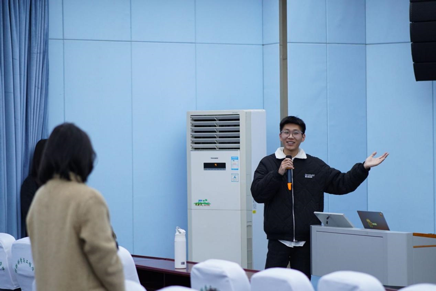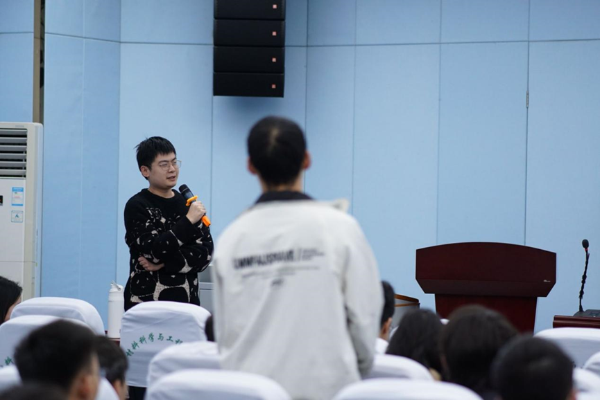 接着,我院2022级硕士研究生刘宏也进行了精彩的汇报。刘宏在硕士期间以第一作者身份在国际高水平期刊《Nature Synthesis》上发表了一篇研究性论文,他本次汇报的主题是《机械-化学协同作用合成长程有序钙钛矿》。他介绍了在机械力与化学过程的协同作用下,钙钛矿晶体沿着特定方向生长,形成具有高度取向性的薄膜结构的研究成果。并鼓励同学们要找准研究方向,抗衡挑战,矢志不渝地追求科研目标。