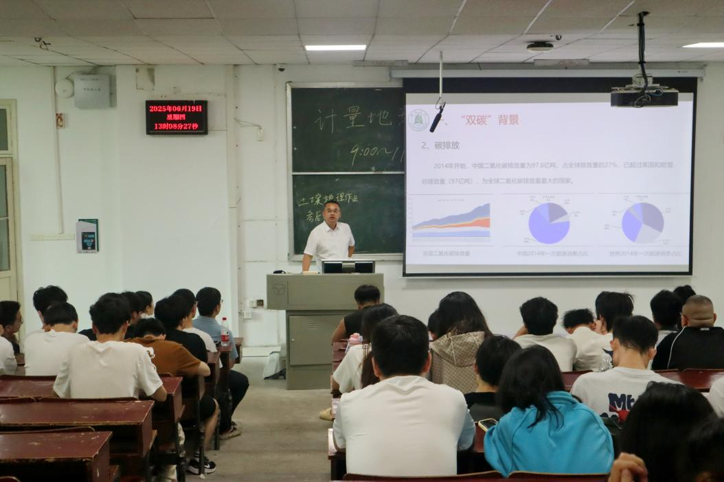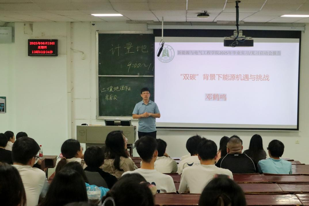 副院长邓鹤鸣以《“双碳”背景下能源领域的机遇与挑战》为题作实习指导报告。他强调,实习是提升学生实践能力与社会适应力的关键环节,鼓励学生在实习中积极参与绿色电力项目、碳减排技术实践,锤炼“新能源系统调试、电气节能改造”等核心技能,为投身“双碳”实践储备本领。
