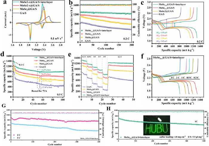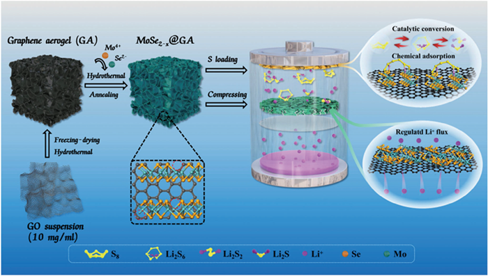 锂硫电池(LSBs)具有较高的理论比容量(1675 mAh·g-1)和能量密度(2600 Wh·kg-1),在新一代储能电池中具有相当大的潜力。然而,严重的穿梭效应和缓慢的氧化还原反应动力学仍然是高性能LSBs亟待解决的问题。在这项工作中,团队设计了富含缺陷的硒化钼修饰的石墨烯气凝胶作为LSBs的阴极硫载体(MoSe2-x@GA/S)和独立中间层(MoSe2-x@GA)。石墨烯网络支撑的无粘结剂硫载体最大限度地提高了电子电导率和锂离子迁移率,并缓解了体极膨胀。具有亲硫亲锂性质的富缺陷MoSe2-x加速了Li2S的成核和解离,而双功能中间层的插入不仅促进了多硫化物的吸附和转化,而且调节了锂的均匀沉积,抑制了锂树枝晶的生长。