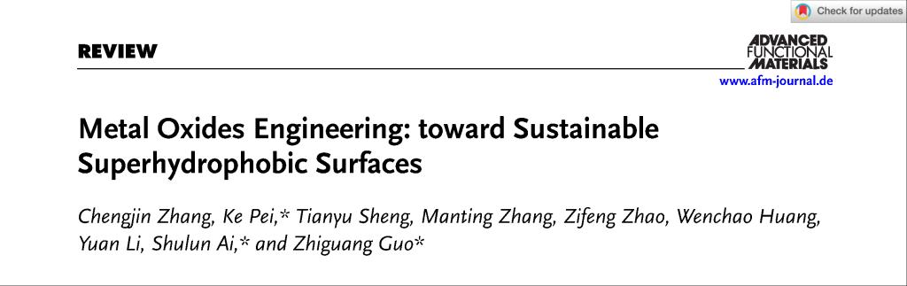 近日,我院新能源材料与器件专业2022级本科生章程锦在学业导师裴颗和郭志光老师(材料科学与工程学院教师)的指导与帮助下,在材料科学Top期刊《Advanced Functional Materials》上发表名为“Metal Oxides Engineering: toward Sustainable Superhydrophobic Surfaces”的综述型论文,章程锦为论文第一作者,裴颗、艾书伦、郭志光老师为论文共同通讯作者。