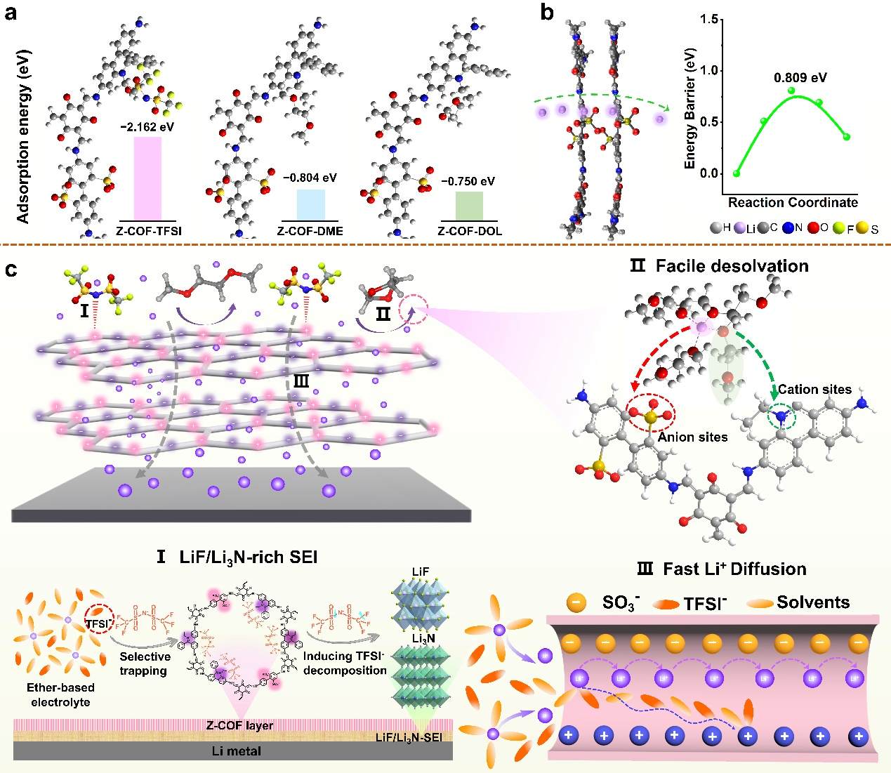本研究设计了一种独特的两性离子共价有机框架材料(Z-COF),并将其作为LMBs负极的界面保护层,旨在调控Li⁺迁移动力学、固态电解质界面(SEI)以及界面电荷分布。该保护层的关键是在有序框架中同时引入带正电荷的乙锭基团和带负电荷的磺酸基团,形成局域具有两性离子特性但整体呈电中性的分子结构。利用两性离子的性质,锚定在同一结构单元中的正、负电荷位点为Li+脱溶提供双向驱动力,引发高效的Li+脱溶。同时,COF纳米通道中的亲锂性磺酸基则为Li+ 的快速扩散提供丰富的跳跃位点。乙锭阳离子与TFSI⁻之间的静电相互作用可增加TFSI⁻中C–F键和S–N键的断裂敏感性,有利于形成富LiF/Li₃N的SEI。此外,单分散的两性离子单元结合COF的规则拓扑结构还可作为离子调节器,在锂金属的反复沉积/剥离过程中动态匀质化界面电荷,抑制锂枝晶生长。