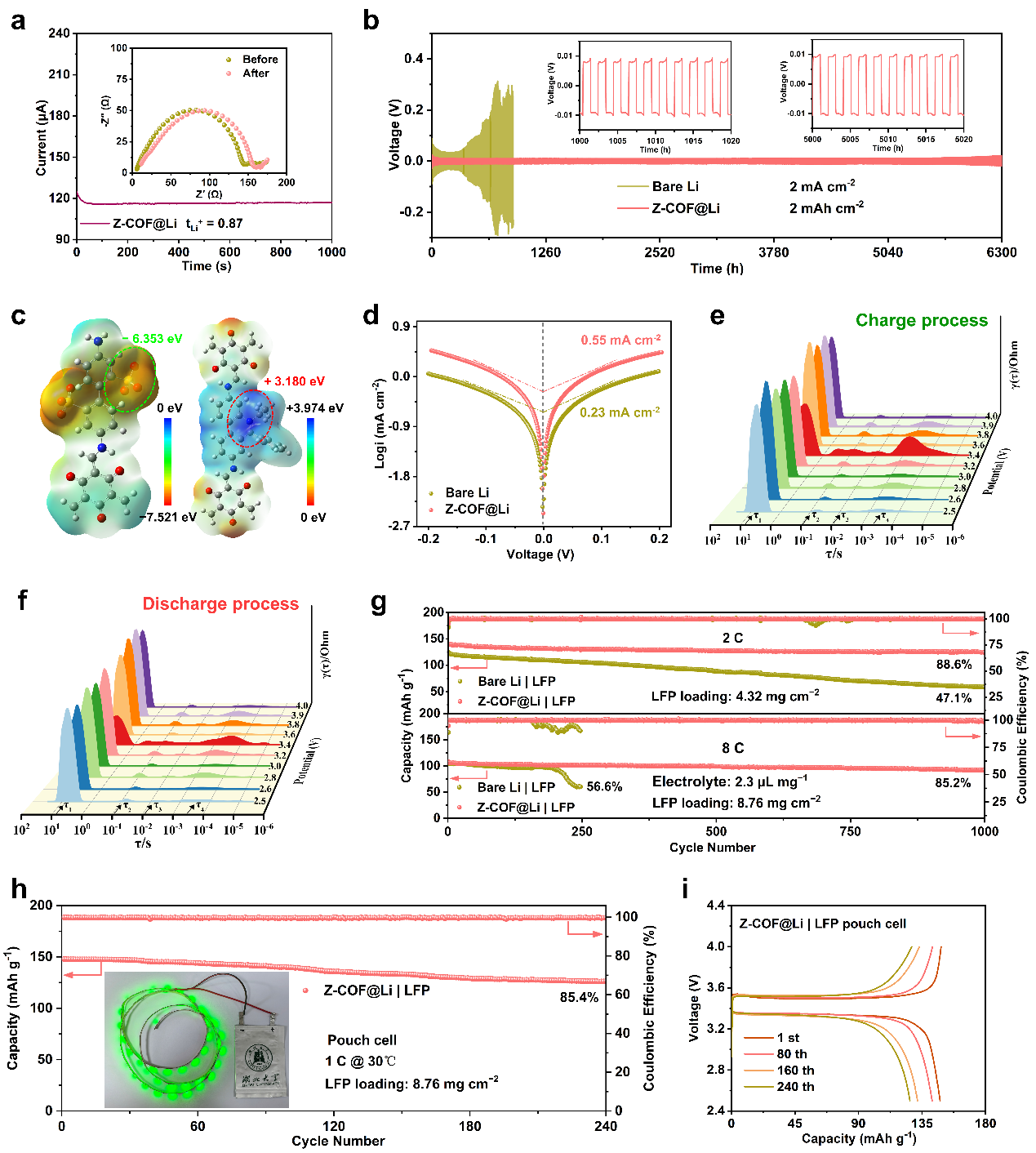 将 Z-COF 用作功能性界面保护层组装电池时,对称电池显示出超高的锂离子迁移数(0.87)和超长的沉积/剥离循环稳定性(6300 h)。与磷酸铁锂(LFP)正极匹配,在大倍率(8 C)、贫电解液(2.3 μL mg⁻¹)和高负载(8.76 mg cm⁻²)的极端条件下循环1000次后容量保持率仍高达85.2%。组装的Z-COF@Li|LFP软包电池可稳定循环超过240次且无明显电压波动。