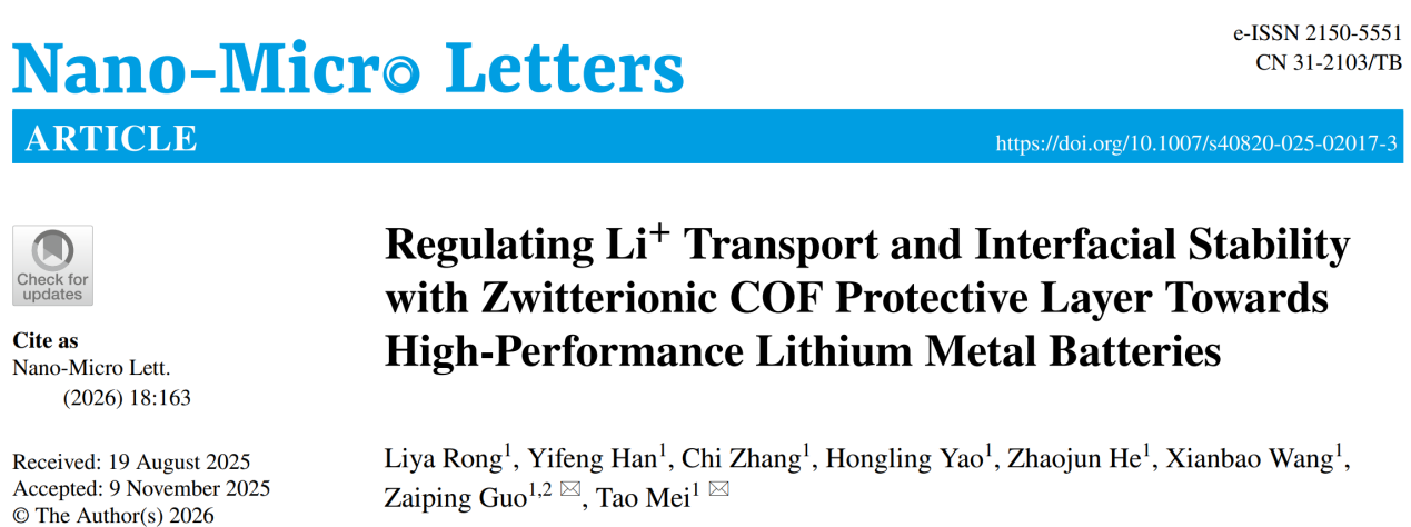 近日,bv伟德国际1946梅涛教授团队在国际顶级期刊《Nano-Micro Letters》(IF=36.3,在JCR纳米科技、材料科学和物理应用三个学科均位列Q1区前5%,其中纳米科技排名全球第2)发表题为《Regulating Li+ Transport and Interfacial Stability with Zwitterionic COF Protective Layer Towards High-Performance Lithium Metal Batteries》的研究成果。伟德victor1946为第一单位,2023级博士研究生戎丽雅为论文第一作者,香港城市大学郭再萍院士、伟德victor1946梅涛教授为共同通讯作者。