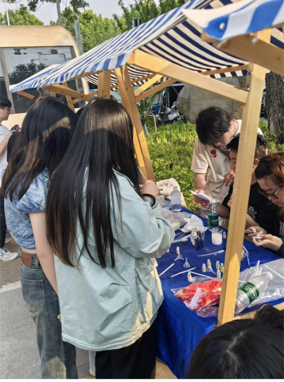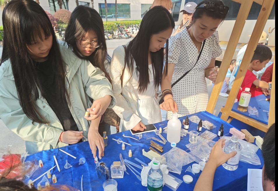 为帮助参与者快速上手,学院特意对志愿者进行了专业培训,从香调分类到混合技巧,细致讲解香水制作的全流程。许多参与者都表示在志愿者的引导下,制作香水也没有那么复杂了。活动过程中,同学们不仅沉浸于调香的乐趣,还通过交换香氛作品、合作创作等形式拉近距离。许多学生手持自制香水瓶与好友合影,记录下这份独特的校园回忆。